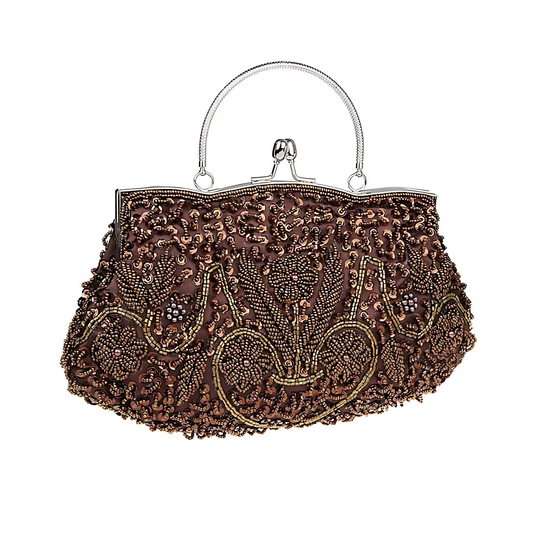 Mocha Satin Sequined Evening Clutch Bag with Silver Handle