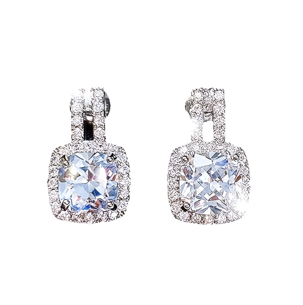 Square Halo Cushion Earrings: Square Moissanite Stud Earrings are made of Square 2pcs/7x7mm + Round 1mm x 68pcs Moissanite Diamonds, Each pair of Moissanite Earrings weighs 4.34 carats. Earrings weigh approximately 2.5 grams. All metals are lead, nickel free and hypoallergenic.