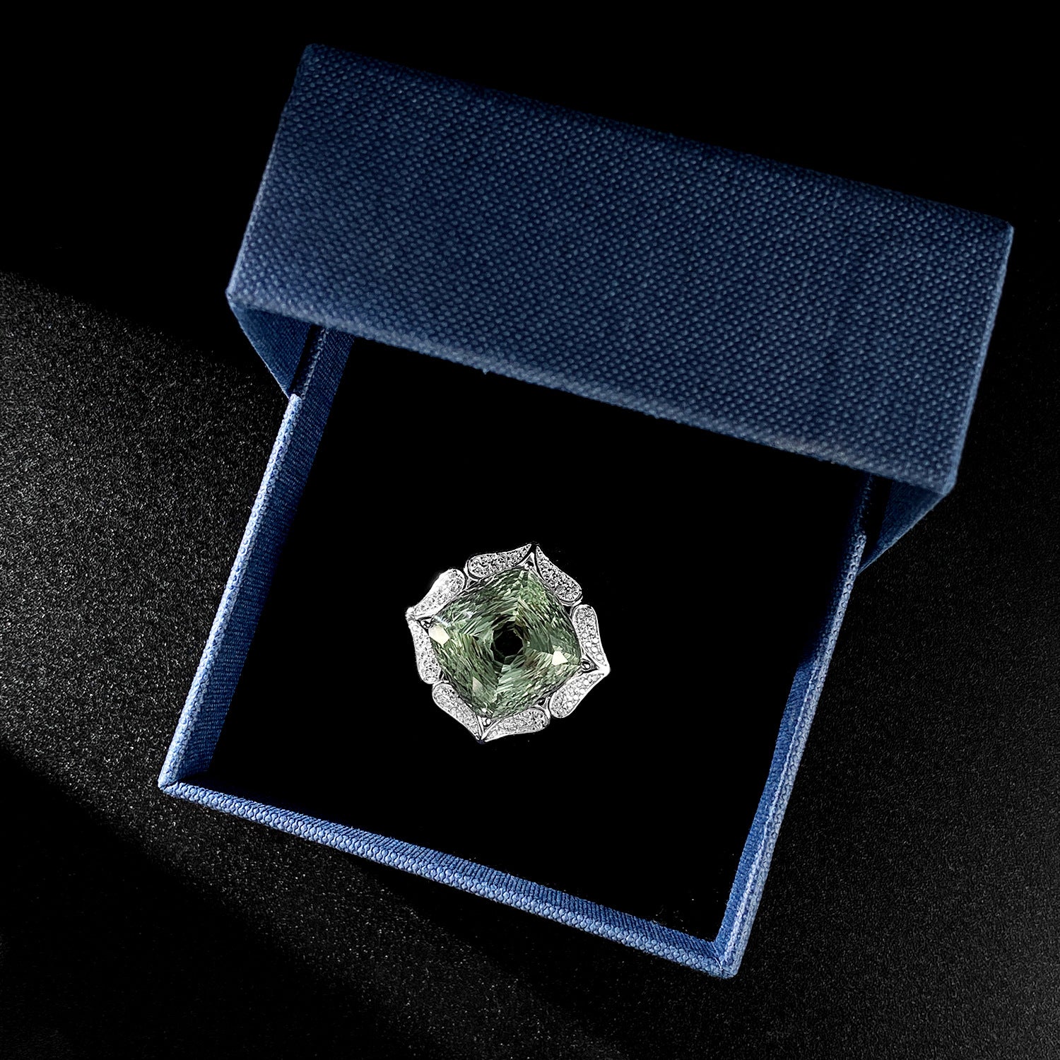 A striking fusion of elegance and contemporary design, the Square Ethereal Green Crystal Sterling Silver Rooftop Ring is a true statement of sophistication. The 22-carat cushion-shaped ethereal green crystal catches the light with breathtaking brilliance, its intricately faceted surface creating a mesmerizing play of reflections. The sculptural sterling silver setting embraces the crystal in a delicate floral-inspired design, enhanced by pavé-set accents that add subtle sparkle. Crafted from high-quality 925 sterling silver, this ring is designed for those who appreciate bold beauty with a refined touch.