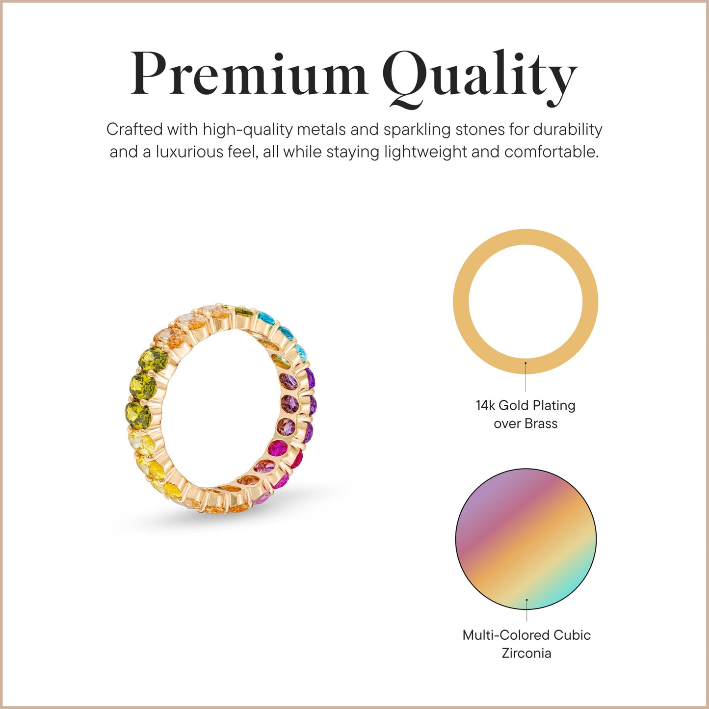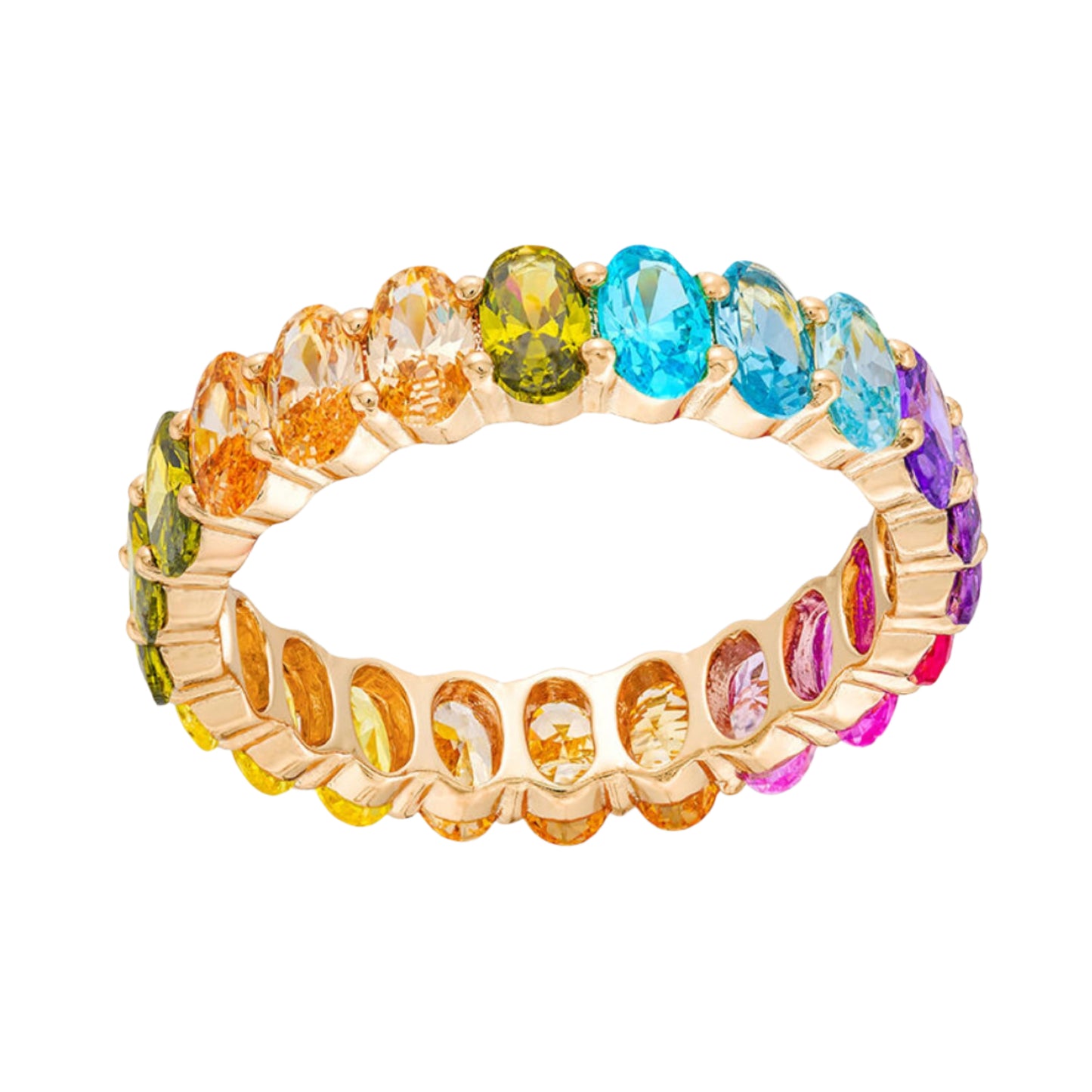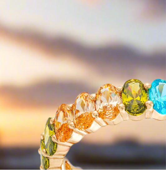 - 14k Gold Plated with Cubic Zirconia: This women's ring features high-polish, 14k gold plating over brass, and is studded with multi-colored, oval cubic zirconia