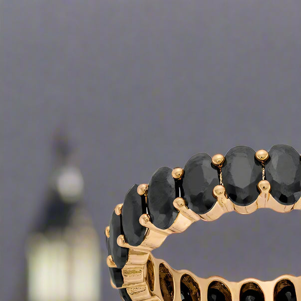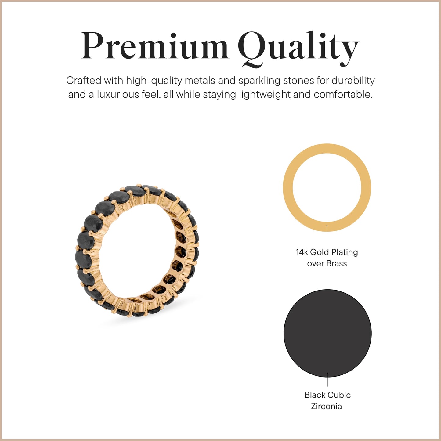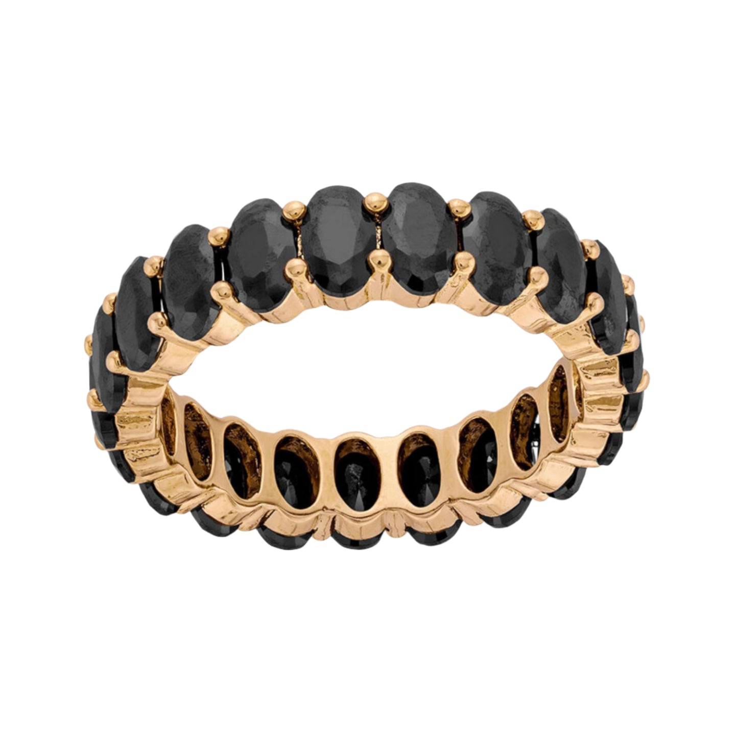 - 14k Gold Plated with Cubic Zirconia: This women's ring features high-polish, 14k gold plating over brass, and is studded with black, oval cubic zirconia