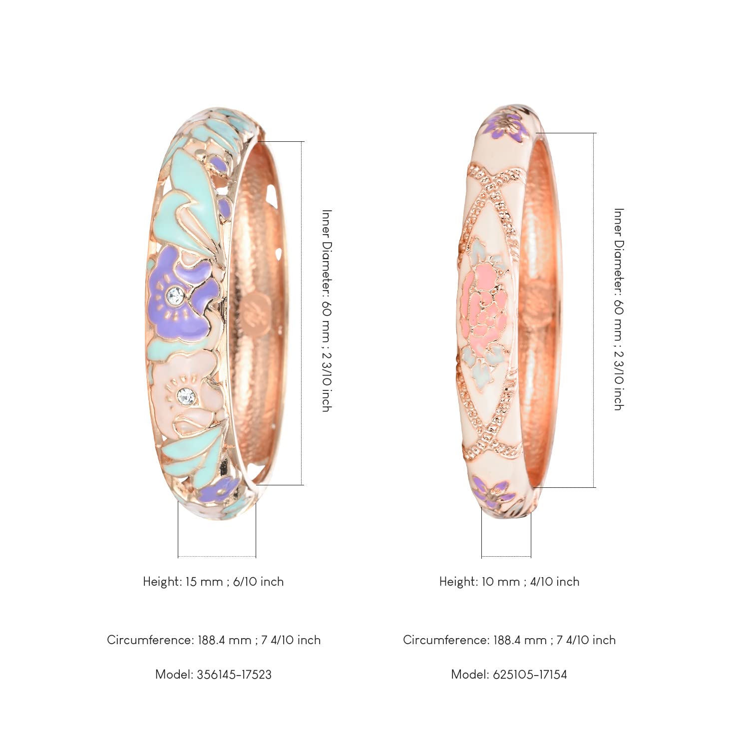 - Cuff bangles 2 pcs set; Inner diameter: 2.4 inch (60mm), inner circumference: 7.4 inch (188mm), width: 0.6 inch (14mm) and 0.4 inch (10mm); Spring hinged opening clasp, comfortable for adults.